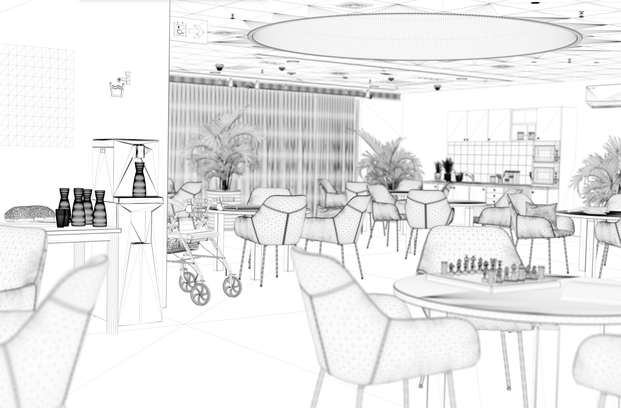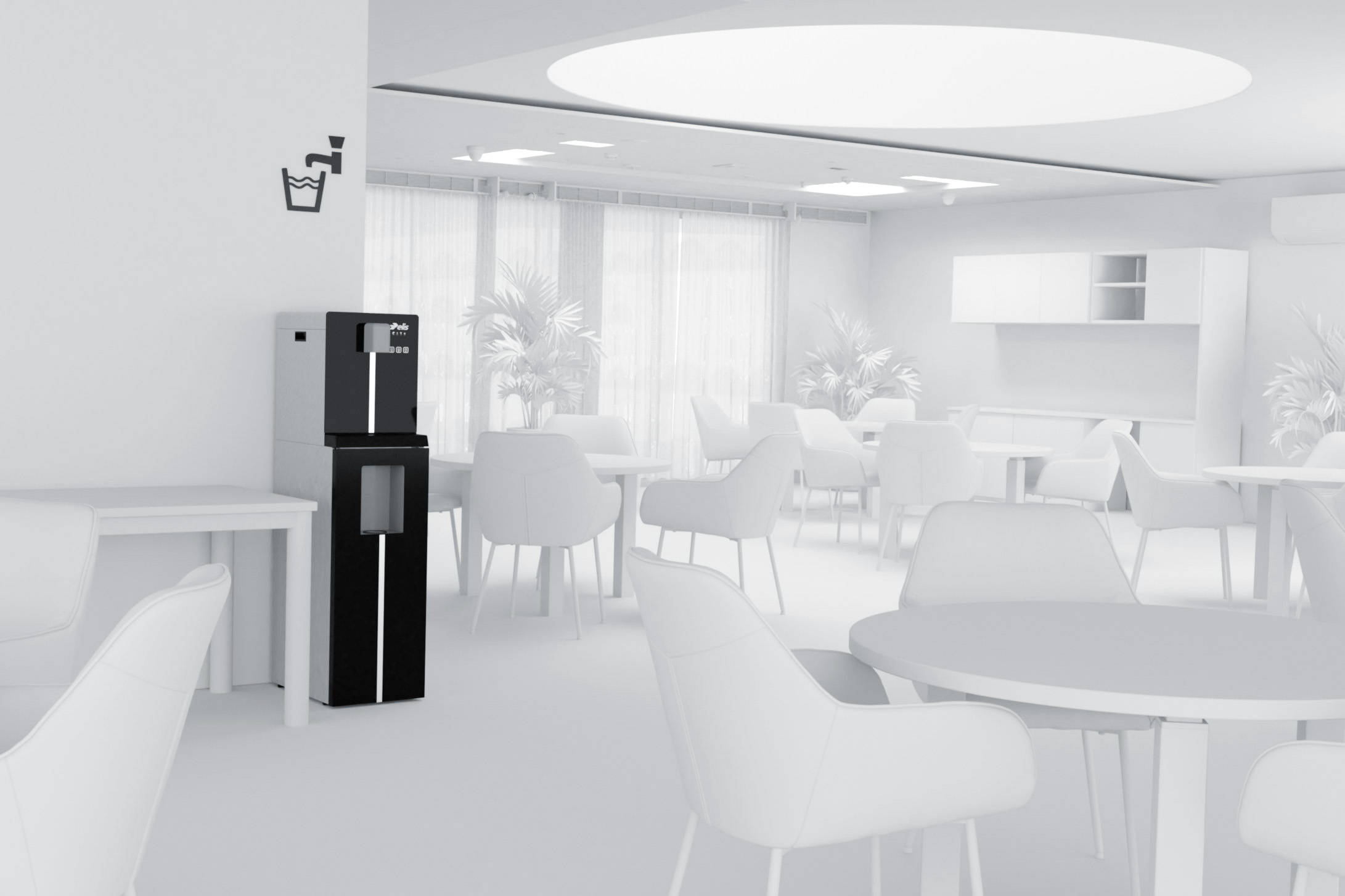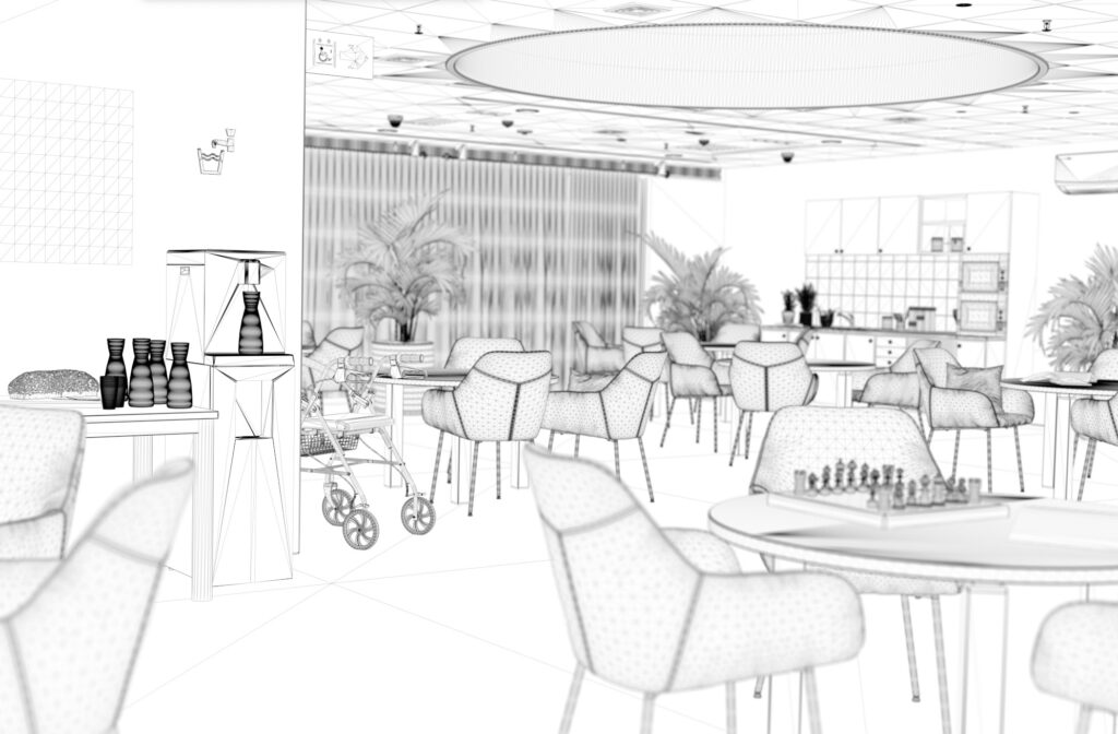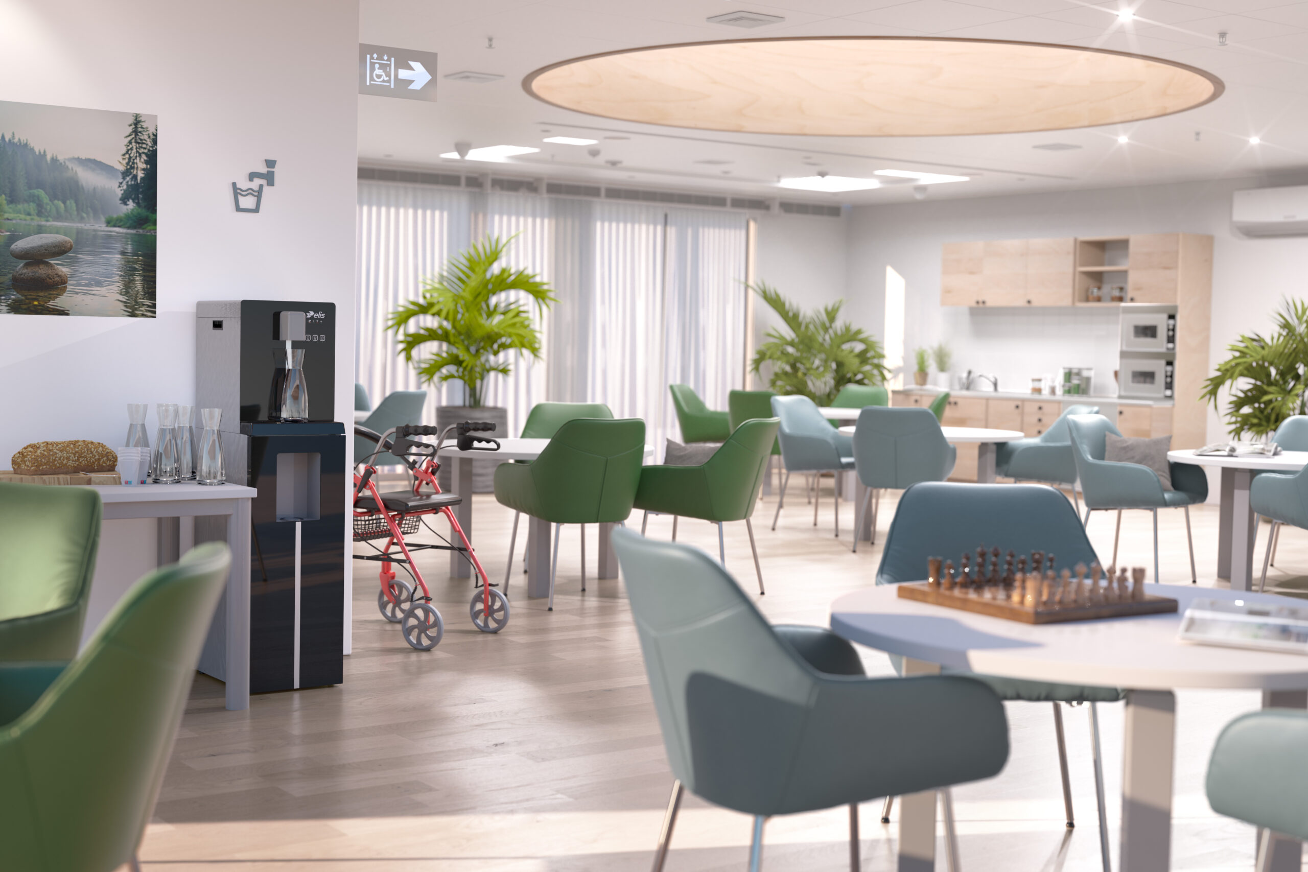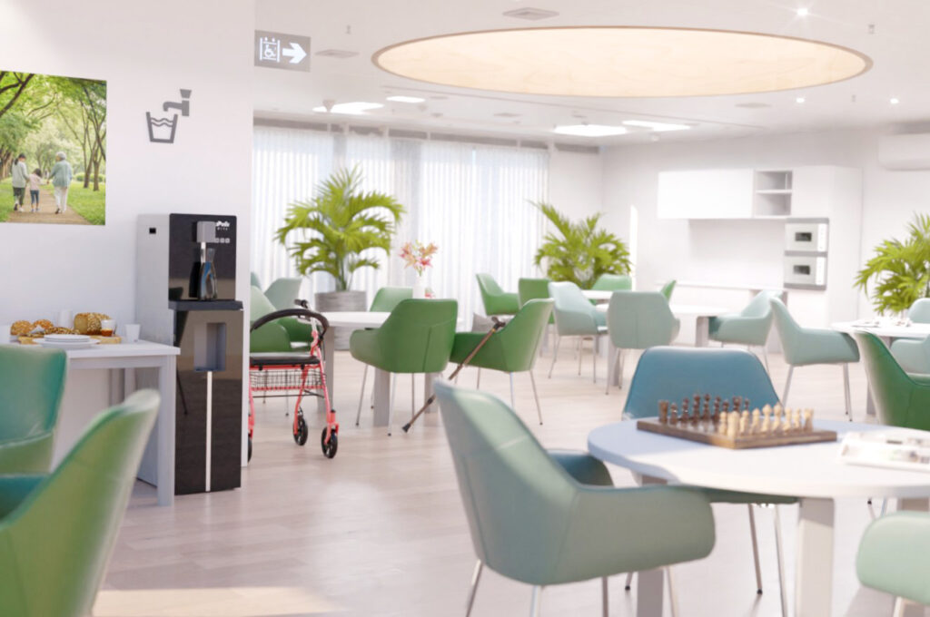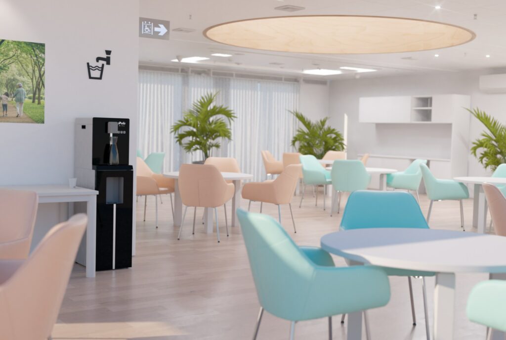 Ce projet a été réalisé pour le département boisson de Elis, autour d’un visuel mettant en scène une fontaine à eau intégrée dans l’environnement d’un EHPAD. L’objectif était de proposer une image à la fois réaliste, rassurante et fonctionnelle, en tenant compte des usages spécifiques de ce type de lieu et de l’importance du confort visuel pour les résidents comme pour le personnel.