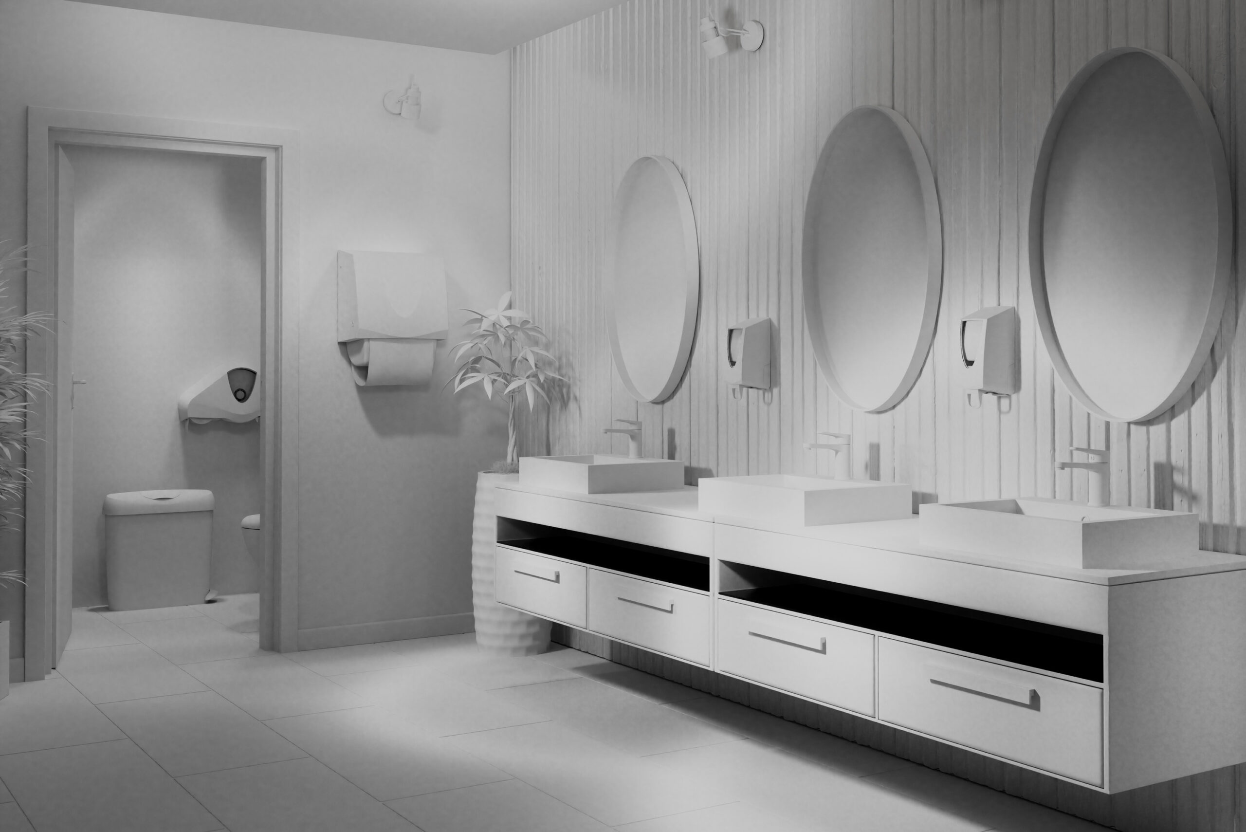 L’ensemble des visuels a été réalisé sous Cinema 4D avec Octane Render. Le travail de lumière et d’ambiance constitue un axe central du projet : plus doux et maîtrisé pour l’univers hôtelier, plus neutre et direct pour l’environnement sanitaire standard, tout en maintenant une cohérence globale sur l’ensemble de la série.