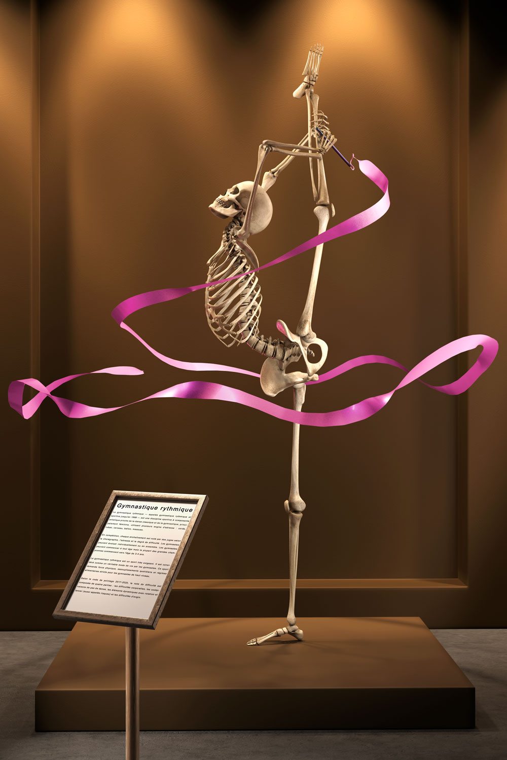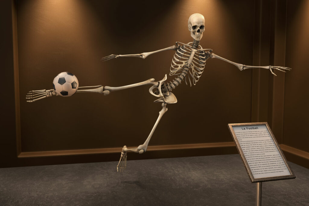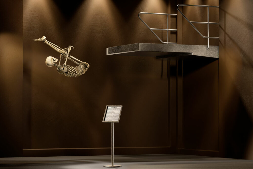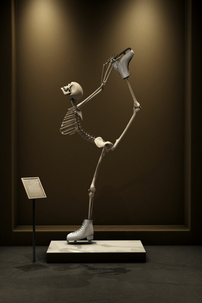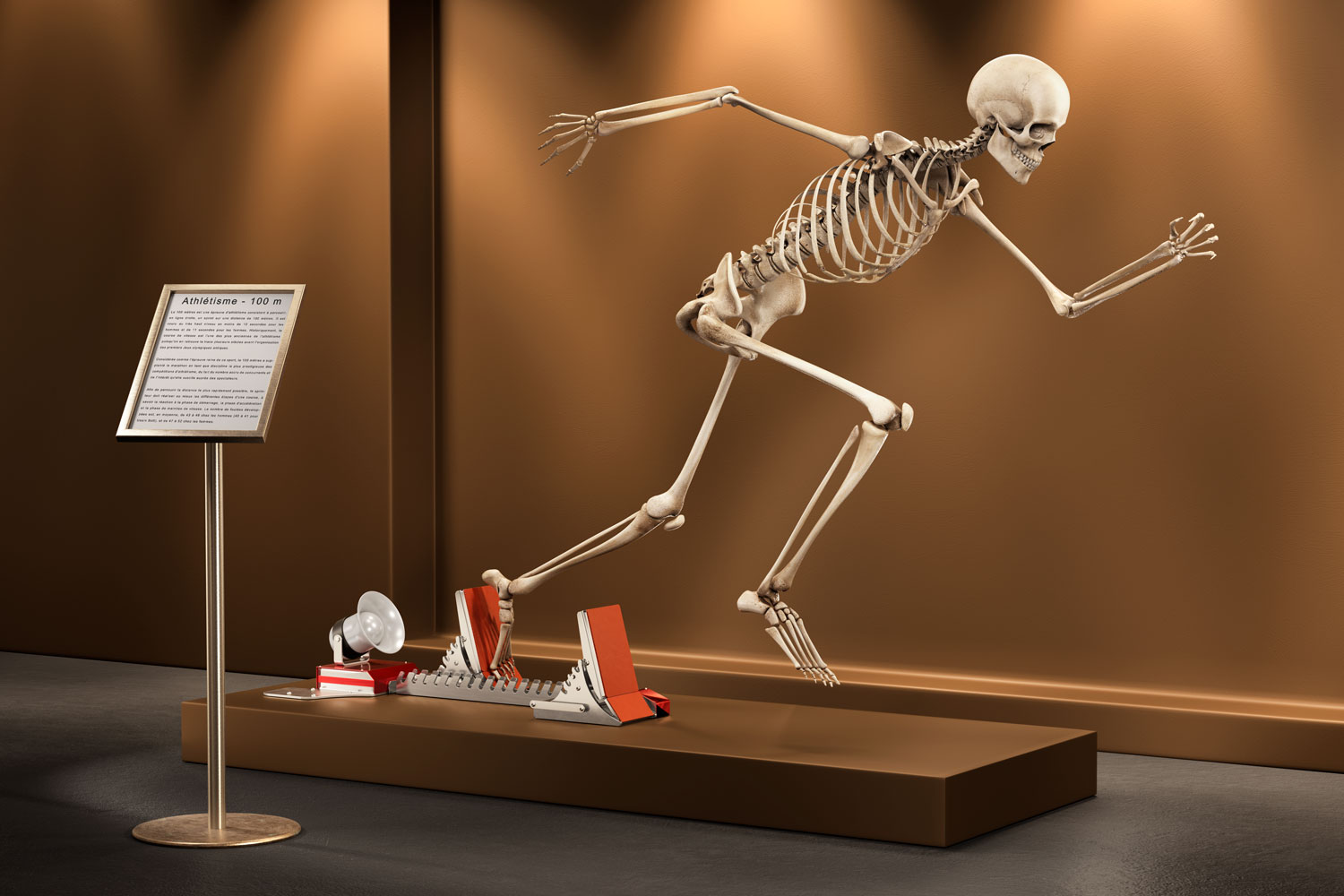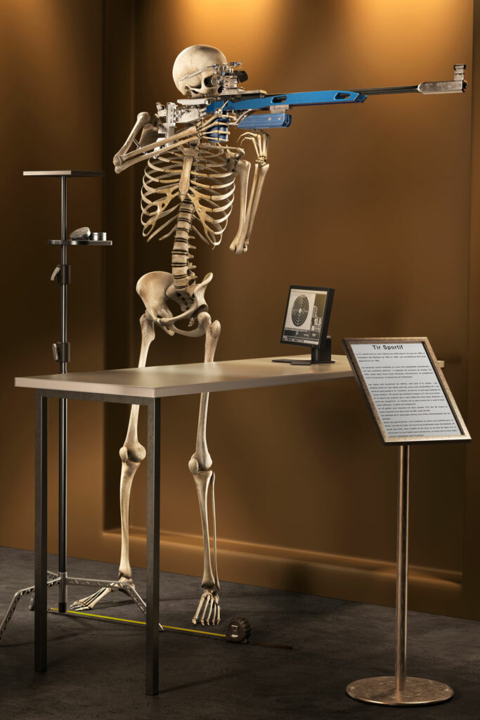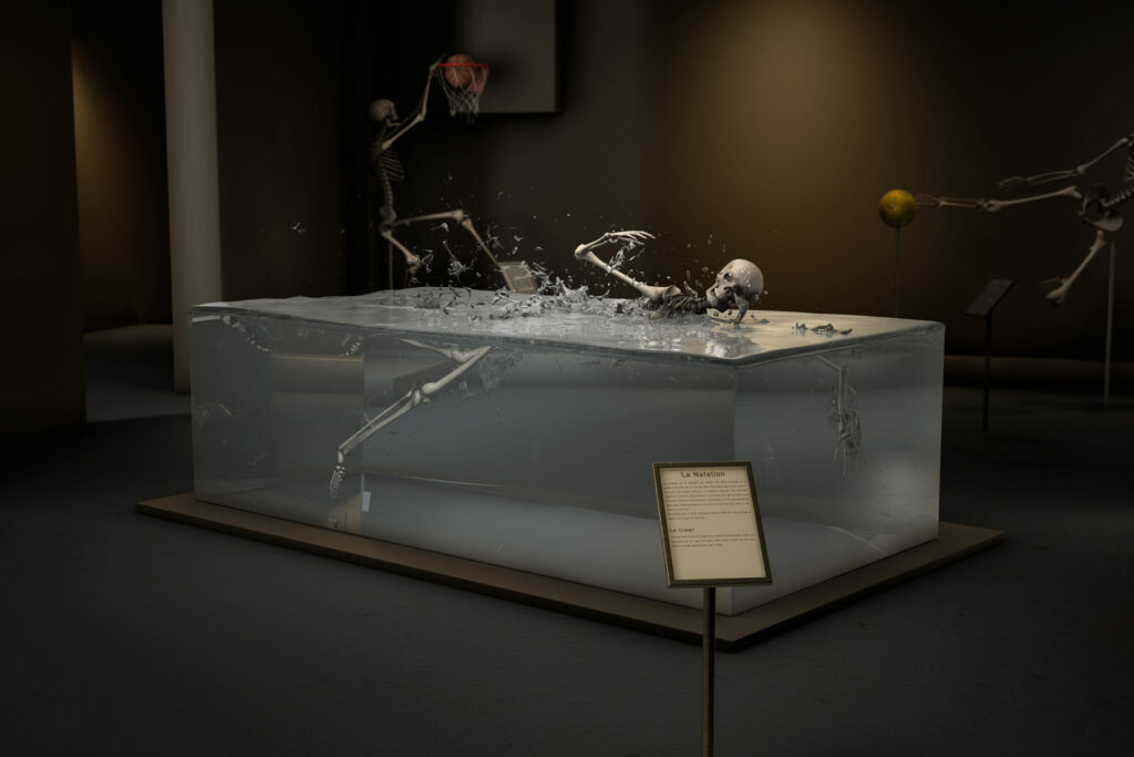 Le choix du squelette comme figure centrale permet de dépouiller le geste de toute identité individuelle pour en révéler l’essence pure. Il devient ainsi un symbole d’universalité et d’homogénéité humaine, mettant en lumière l’émotion brute du mouvement sportif.