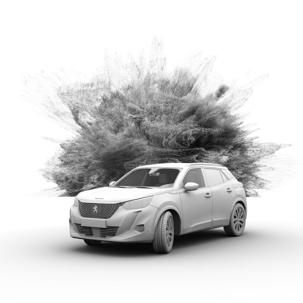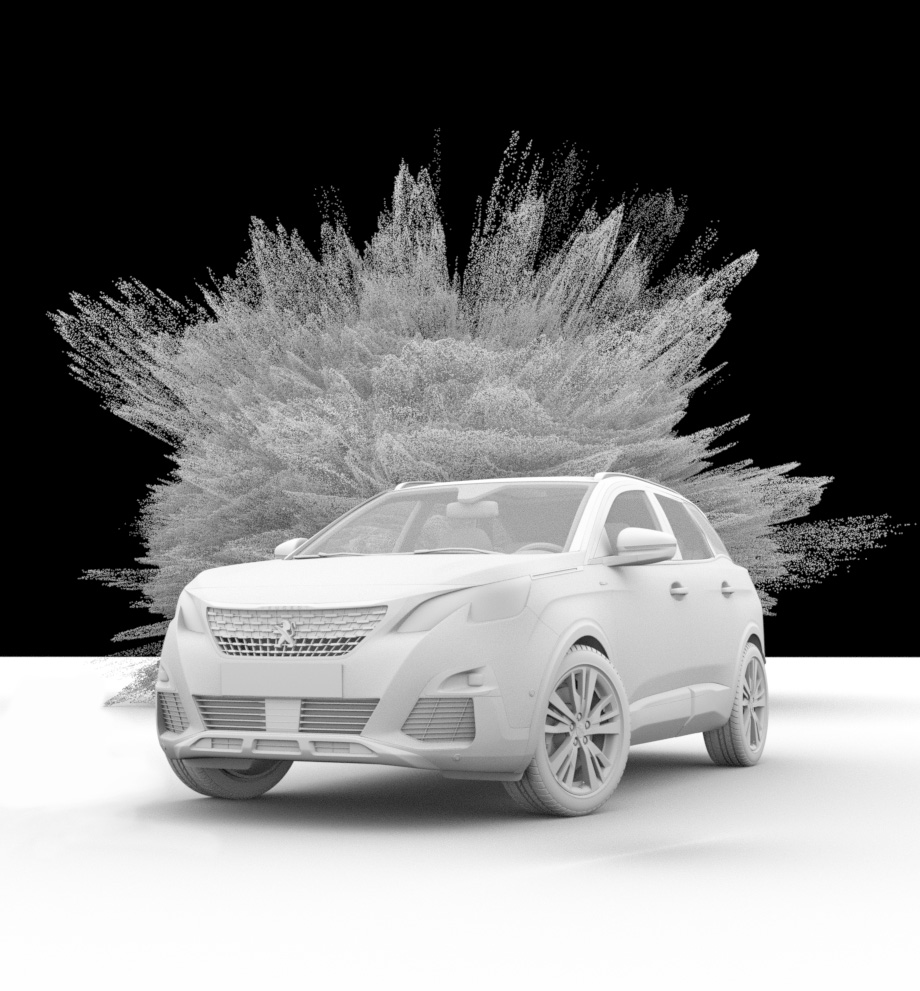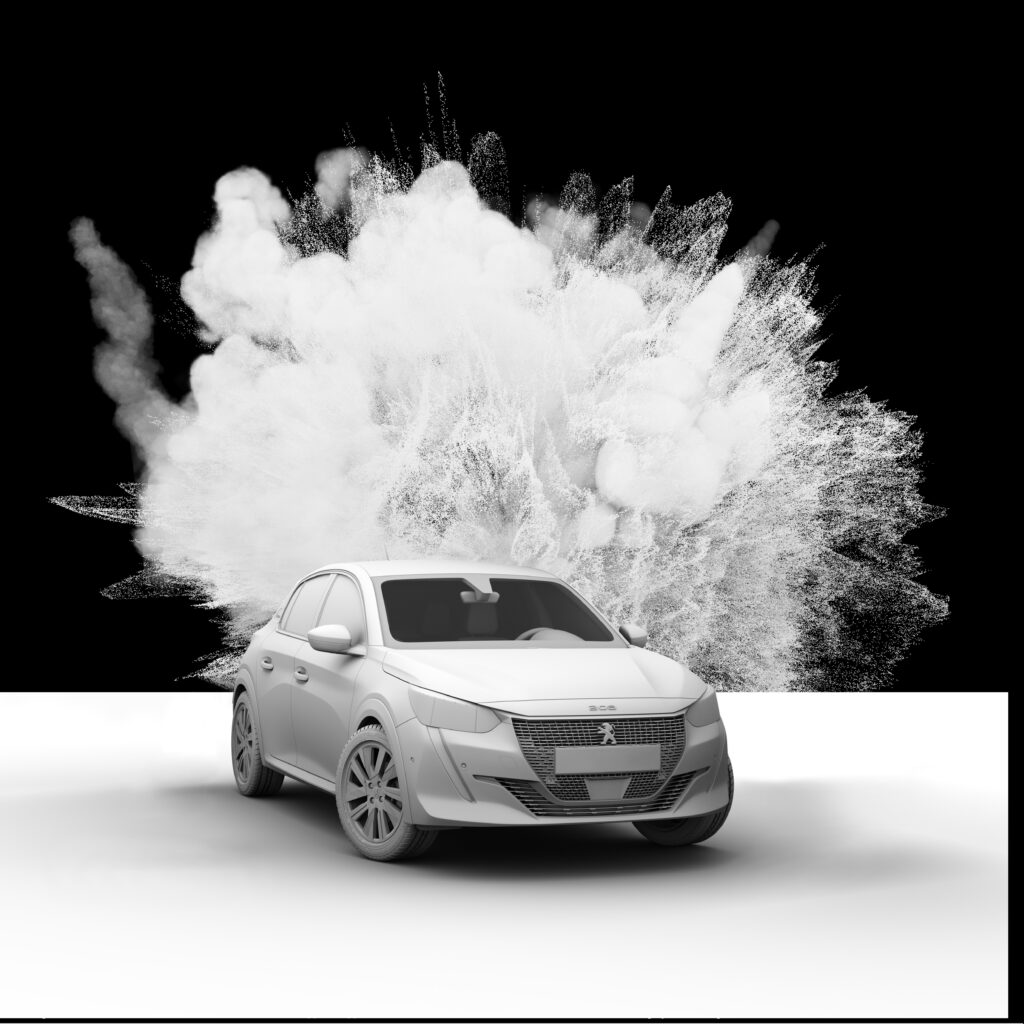 Les rendus ont été réalisés sous Cinema 4D avec Octane Render, en portant une attention particulière à la cohérence entre le rendu studio du véhicule et le comportement physique des particules (densité, diffusion, lumière, contraste).