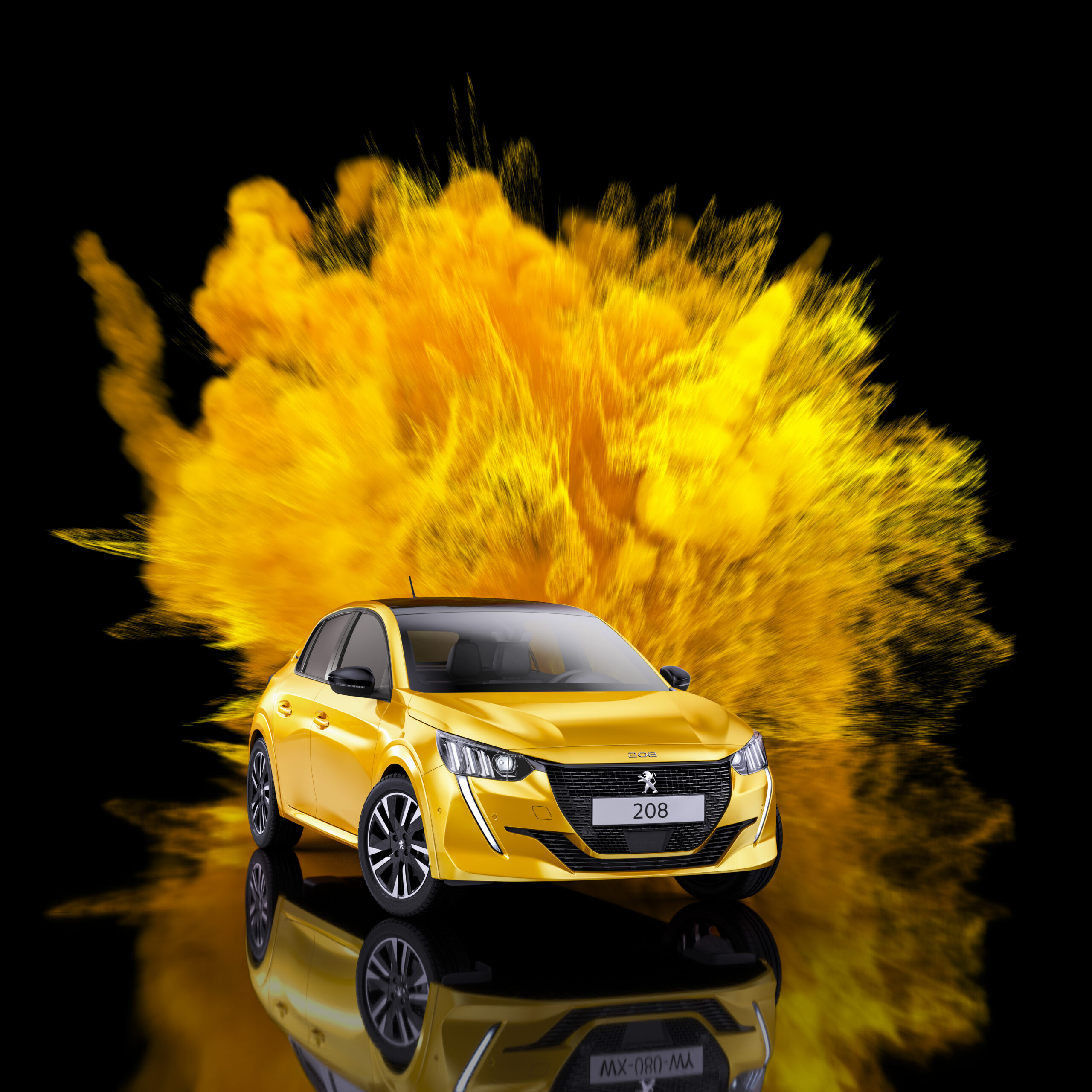 En arrière-plan, une explosion de particules, générée dans la même teinte que la carrosserie, vient prolonger visuellement la couleur et lui donner une dimension expressive. Cette projection chromatique n’est pas décorative : elle symbolise l’intensité, l’énergie et l’impact visuel de la couleur, comme si celle-ci se libérait de la voiture pour envahir l’espace.