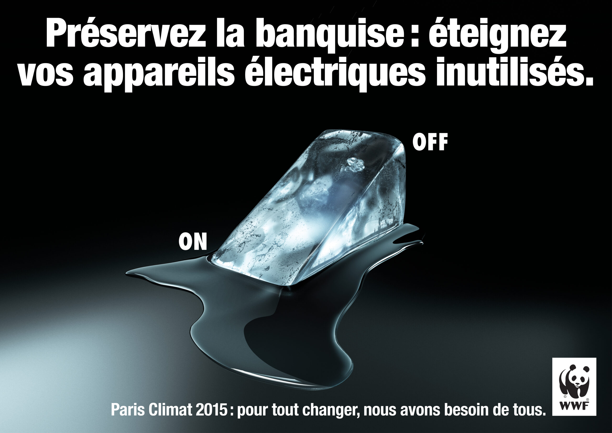 La première image aborde la question du réchauffement climatique. Un glaçon en forme d’interrupteur, marqué des positions on et off, est présenté sur fond noir. Cette métaphore visuelle évoque à la fois la fragilité du climat et l’idée qu’une action reste possible : celle d’arrêter, ou au moins d’inverser, le processus en cours. Le contraste entre la matière glacée et le symbole mécanique renforce la tension entre urgence et responsabilité humaine.