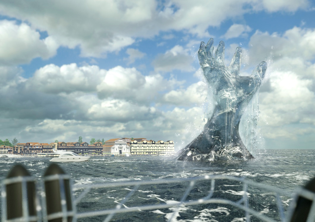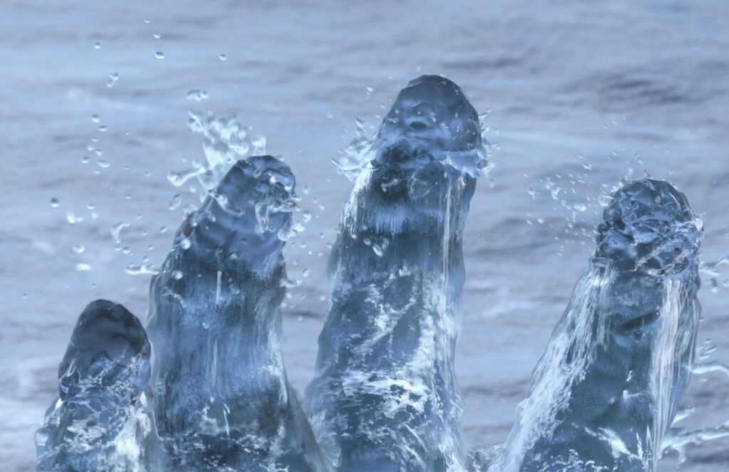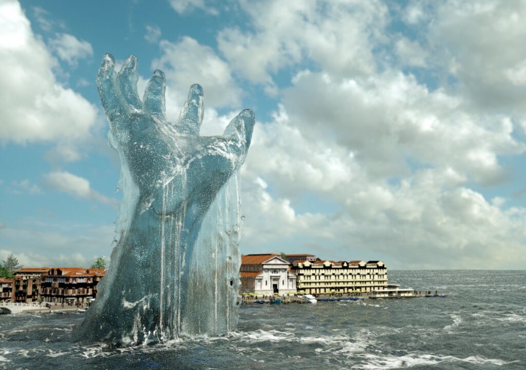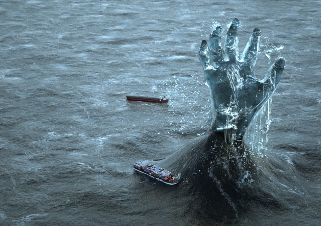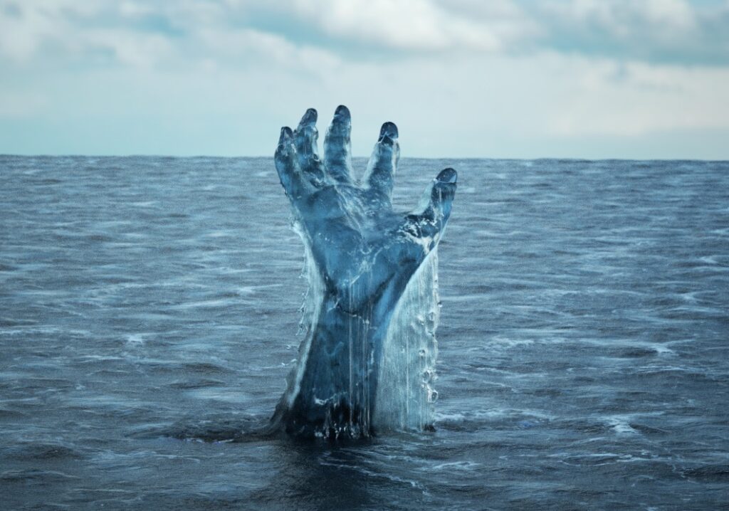 La seconde image s’intéresse à la pollution des océans et à leur état critique. Une main géante émerge des profondeurs marines, comme si l’océan lui-même tentait de communiquer avec nous. En faisant jaillir l’eau, ce geste suggère à la fois un appel à l’aide et une réaction face aux agressions qu’il subit.
